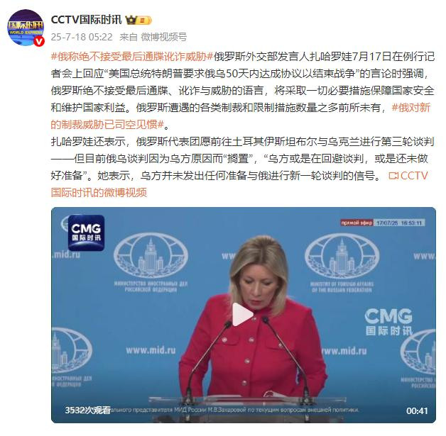 俄罗斯外交部发言人扎哈罗娃7月17日在例行记者会上回应“美国总统特朗普要求俄乌50天内达成协议以结束战争”的言论时强调,俄罗斯绝不接受最后通牒、讹诈与威胁的语言,将采取一切必要措施保障国家安全和维护国家利益。俄罗斯遭遇的各类制裁和限制措施数量之多前所未有,俄对新的制裁威胁已司空见惯。